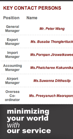 BILLION LOGISTICS CO., LTD. 889 Thai CC Tower, 20th Flr., South Sathorn Rd.,Yannawa, Bangkok 10120 Tel : +66 2 672 3833 - 4 ( auto) Fax :+66 2 672 3822 - 3